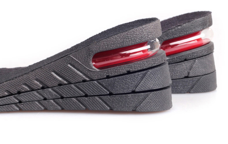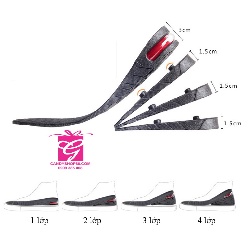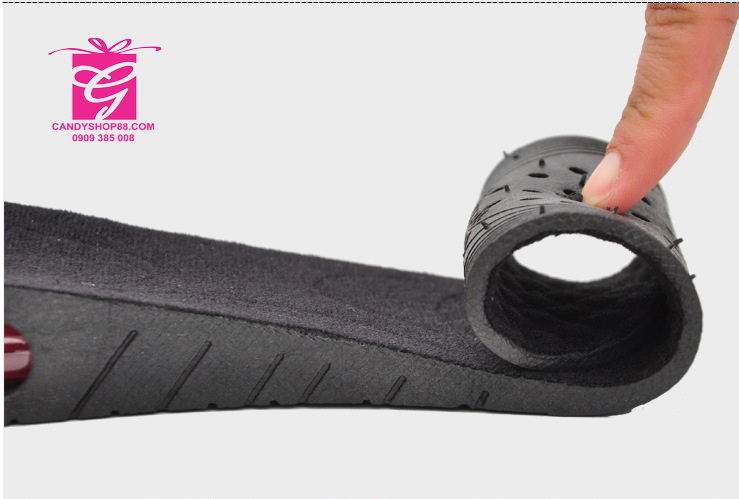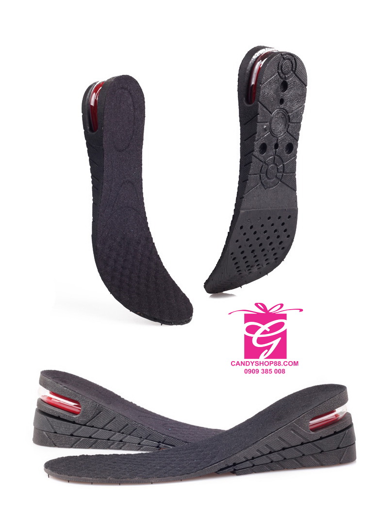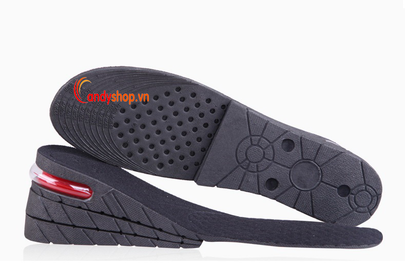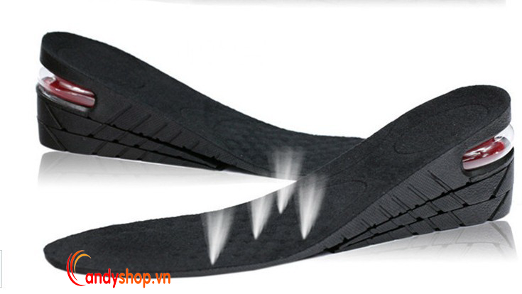 Sản phẩm Lót giày tăng chiều cao gồm 3 lớp, có thể tháo gỡ ra từng lớp để sử dụng thích hợp. Lớp trên là một miếng lót giày kéo từ gót chân đến bàn chân, tạo cảm giác thoải mái cho chân đặc biệt là các bạn nam không quen khi bị nâng gót chân lên, bề mặt được tráng lớp nhung vải, ở phần gót chân được nén không khí lợi với một độ đàn hồi nhất định, phù hợp cho giày thể thao, không bị lúng hay nhúng khi vận động.