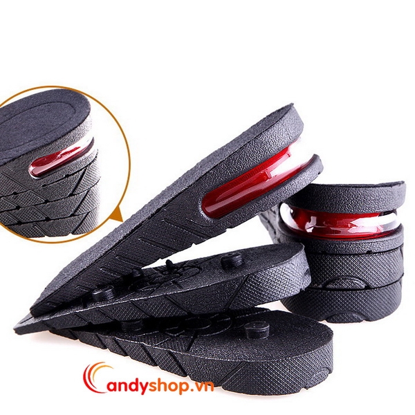 Sản phẩm Lót giày tăng chiều cao không khí nửa bàn gồm 3 lớp, có thể tháo gỡ ra từng lớp để sử dụng thích hợp. Lớp trên là một miếng lót giày kéo từ gót chân đến bàn chân, tạo cảm giác thoải mái cho chân đặc biệt là các bạn nam không quen khi bị nâng gót chân lên, bề mặt được tráng lớp nhung vải, ở phần gót chân được nén không khí lợi với một độ đàn hồi nhất định, phù hợp cho giày thể thao, không bị lúng hay nhúng khi vận động.