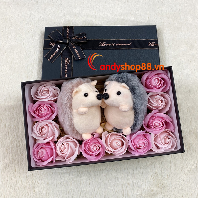 1 Hộp quà màu đen 24.8 x 14 x 9cm + 12 bông + 1 cặp móc khóa nhím (không kèm túi giấy và thiệp)