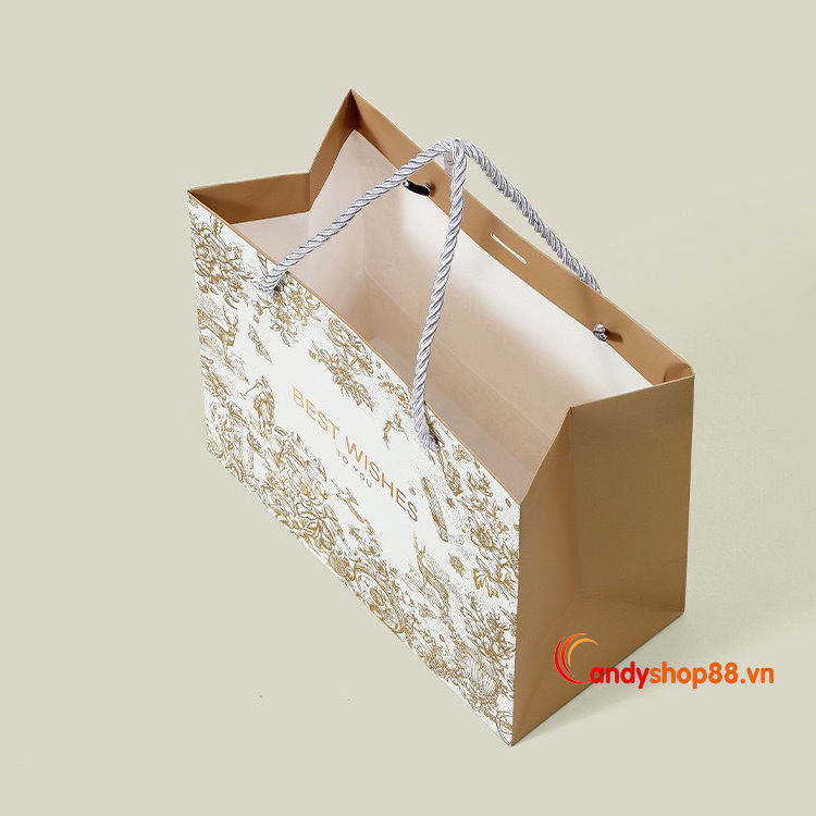 Chất liệu túi giấy ivory in họa tiết đẹp với đường keo chắc chắn sẽ giúp bảo vệ sản phẩm của bạn đến tay khách hàng.